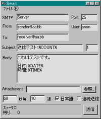 ・件名、本文を任意に設定でき、連番の数値、日付、時間の変数を使うことができます。